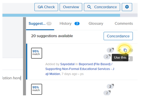 Top left you can find suggestions, history of previews translation done. This is very useful as you progress where you will find similar string to translate. If in a suggestion you have a 100% match, you can simply copy this to your working area by clicking the icon (see example)