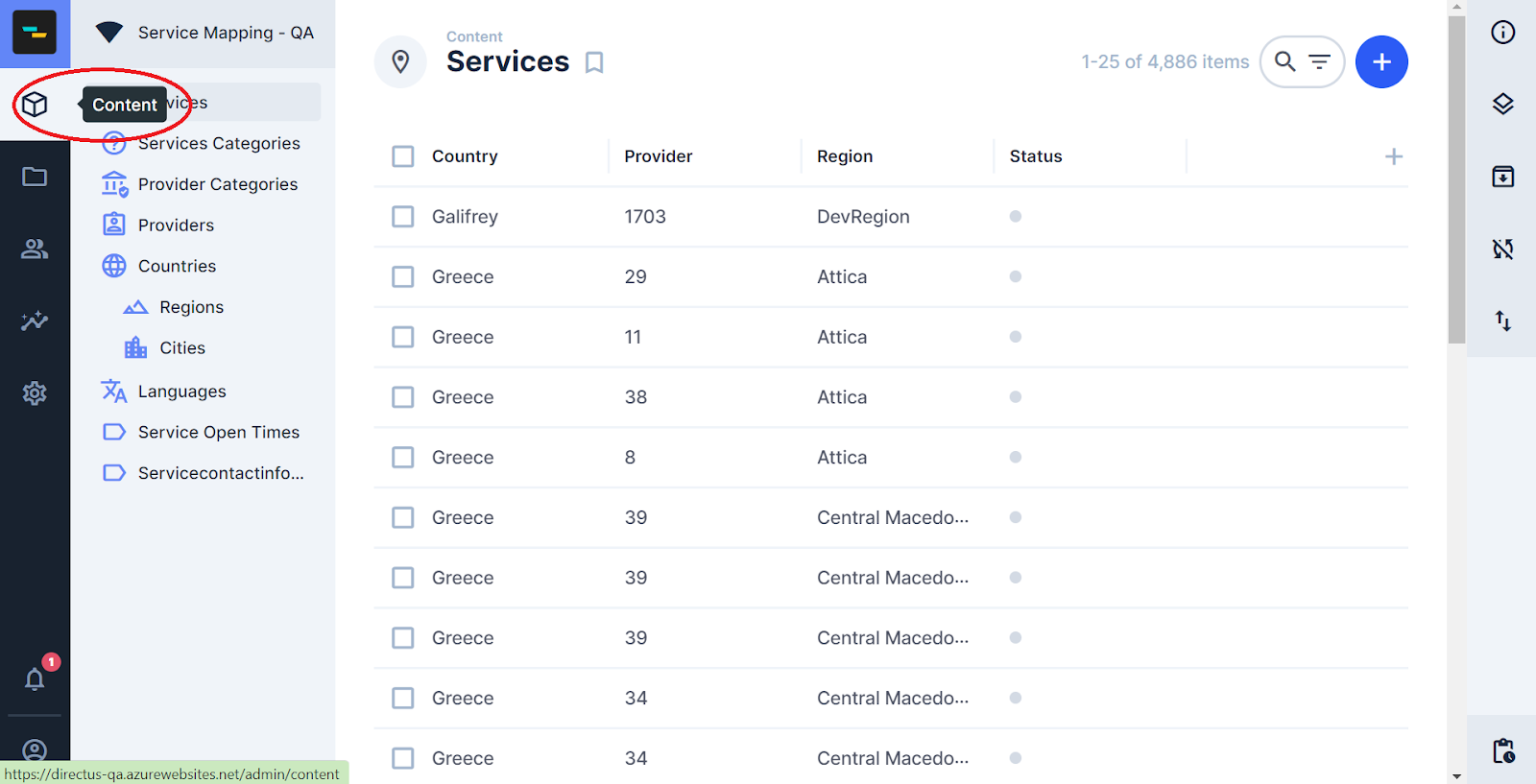 To begin creating a new service on the Service Map, locate the Content Category icon, which is represented by a 3-Dimensional cube. Click on it to access the content management area.
