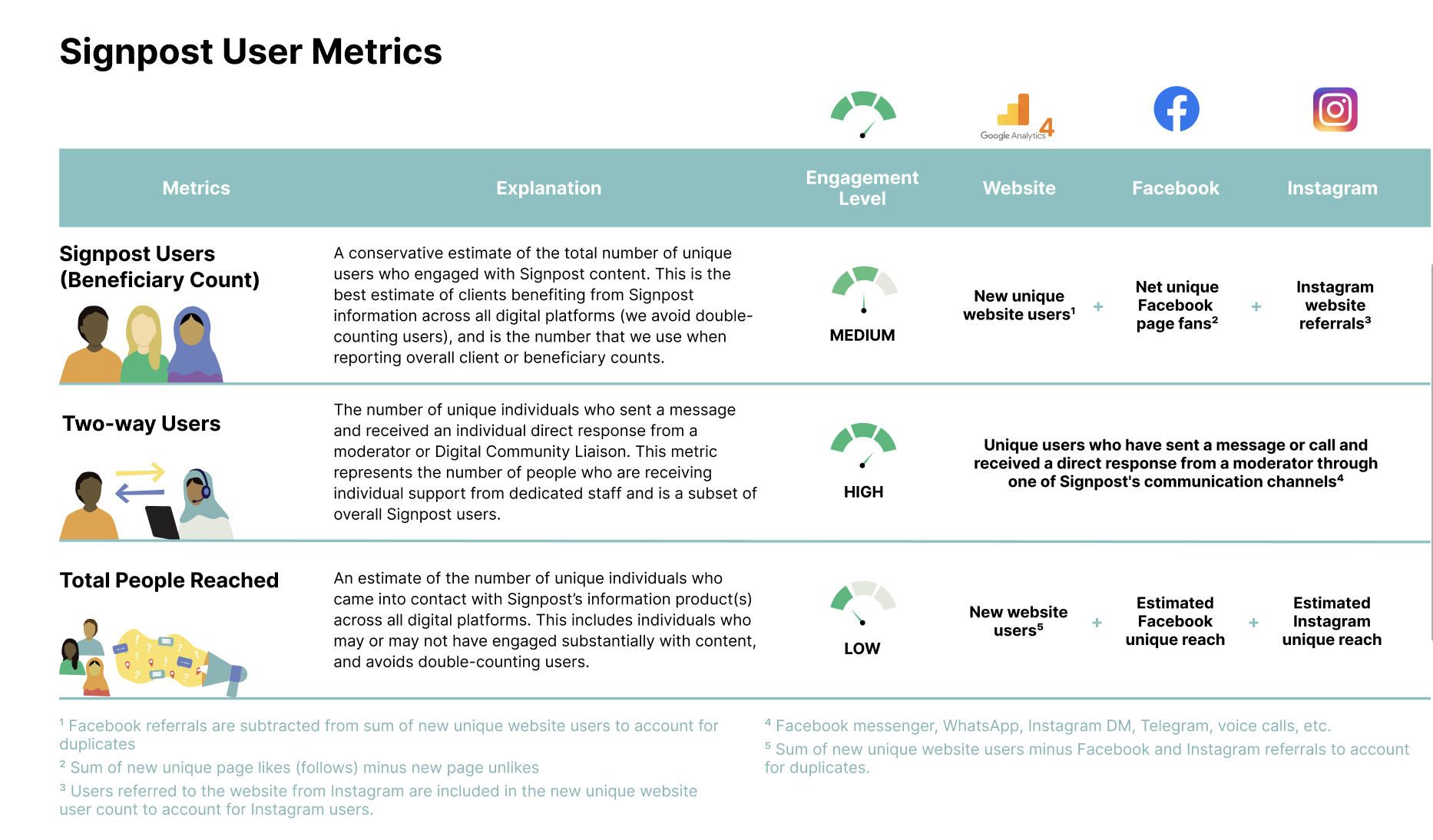 To measure users, Signpost has developed three composite metrics that allow understanding unique users at three different scales outlined below, depending on the level of engagement sought. By using such measures, Signpost can obtain a more comprehensive view of user engagement across all programs and channels. While each metric provides a different level of insight, they are all critical for understanding the impact of Signpost programs within the digital environment in which we operate. It is important to note that Signpost's measurement strategy will continue to evolve and adapt as we expand our toolkit to include other digital platforms beyond Google, Facebook and Instagram, to TikTok, YouTube, and beyond.