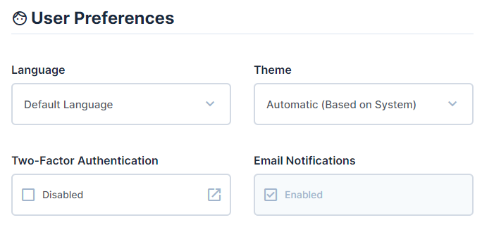 Preferencias del usuario : Preferencias como el idioma predeterminado del sistema, el tema y la opción para la autenticación de dos factores y la notificación por correo electrónico están disponibles en esta sección. |