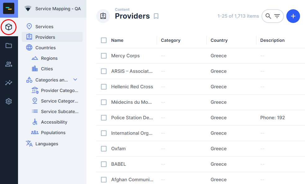 Pour commencer à créer un nouveau fournisseur, localisez l'icône de catégorie de contenu, qui est représentée par un cube en 3 dimensions. Cliquez dessus pour accéder à la zone de gestion de contenu.